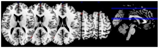 Relationship between lutein and zeaxanthin and brain activation. The figure depicts brain activation during the JLO task minus active baseline contrast that was significantly and negatively related to macular pigment optical density (MPOD) levels. In other words, individuals with lower levels of lutein and zeaxanthin showed an increased BOLD signal in these regions (i.e., “neural inefficiency). The activation is superimposed on a single-subject anatomical template in MNI space provided by MRIcron [56]. To conserve space, only five slices were selected to showcase task-related BOLD response based on the largest extent activation.