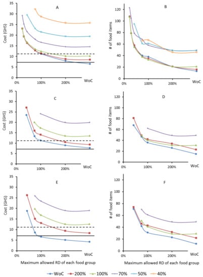Cost (A,C,E) and diversity (B,D,F) of food baskets (FBs) for a Ghanaian family of four. Each point within the charts represents a nutritionally adequate FB. The FBs were optimized based on the foods available in the urban (UFB: urban food basket, Charts A,B) or in the rural environment (RFB: rural food basket, Charts C,D). Charts E+F build also on foods available in rural areas but include wild foods (RWFB: rural wild food basket). In the charts, each line represents a set of FBs that underlies the same constraint on the maximum contribution of a single food per food group (without constraint (WoC), 200%, 100%, 70%, 50% and 40%). Values on the X-axes indicate maximum allowed relative deviation (RD) from food group weights reported by most recent Ghanaian Food Balance Sheets [35]. The horizontal lines indicate threshold limits for poverty (USD 3.1, GHS 11.9, dashed) and extreme poverty (USD 1.9, GHS 7.3, solid). GHS, Ghanaian Cedi.