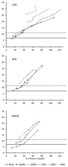 Only a few foods (11–14) are needed to cover all nutrient recommendations for one day (Table 2). Subsequently, the composition and cost of 69 additional FBs were calculated, all of which met the energy and nutrient recommendations. The proportion of each food was limited within each food group to ensure a greater daily variation. The number of foods in urban and rural FBs increased from 13 up to 108 and from 14 up to 68 respectively. If wild foods were incorporated into the rural basket the number of foods rose from 11 up to 71 (Figure 1). As the number of foods increased so did the cost: up to GHS 23.0, 23.5 and 18.8 (USD 6.0, 6.1 and 4.9) per day for the UFB, RFB and RWFB, respectively.