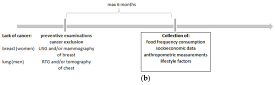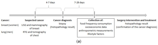 Two separate study protocols with case-control designs were developed. These studies were conducted in 2013–2016 among adults from Northeastern Poland. The cancer sample involved women with breast cancer and men with lung cancer, diagnosed from biopsy histopathology results. All cancer cases were newly-diagnosed (primary diagnosis). The time from cancer diagnosis until participation in the study ranged from 7 days to 28 days (18 days on average) (Figure 1a). Cases of secondary cancer diagnosis as a recurrence of the disease or outcome of another cancer, or those with benign changes or other types of cancer, either at present or in the past were excluded. Individuals who were currently having, or who had previously had active treatment (e.g., chemotherapy, radiotherapy, hormonal treatment) also did not qualify for the study in order to avoid changes in dietary habits or other behaviours. Surgery intervention and decisions about treatment were made after the study (Figure 1a).