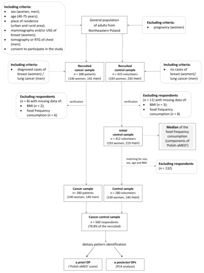 In the current study, it was hypothesized that the Polish adaptation of the Mediterranean diet could be considered for adults living in non-Mediterranean countries for the prevention of breast or lung cancer. Thus, the aim of the study was twofold: (1) to develop the Mediterranean diet score adapted to the Polish diet (‘Polish-adapted Mediterranean Diet’ score), and (2) to study associations between the ‘Polish-adapted Mediterranean Diet’ score and a posteriori-derived dietary patterns with breast or lung cancer risk in adult Poles.