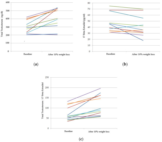 Spaghetti plot of hormonal profile at baseline and after 10% weight loss with individual patient trajectories indicated by colored lines. (a) TT; (b) E2; (c) aromatase enzyme activity, expressed as TT/E2.