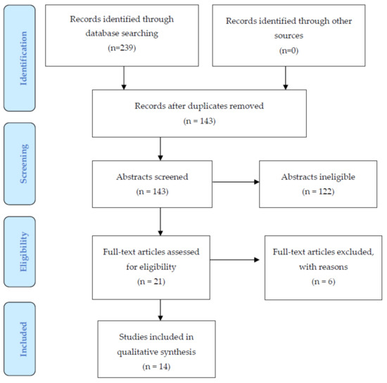 A total of 239 studies were identified from the combined search and following removal of duplicates 143 were reviewed for titles and abstracts. Ultimately, 21 eligible studies were assessed, and 14 of these were selected for full review, all of which were full-text publications [19,20,21,22,23,24,25,26,27,28,29,30,31,32]. Articles were excluded for the following reasons: a general review [36], study of other nutritional factors, e.g., milk and calcium [37,38], lack of comparison group [39], not measuring the outcome of interest/not population of interest [40,41], or published as an abstract [42] (Figure 1).