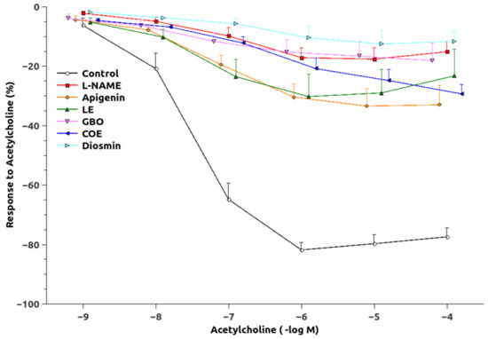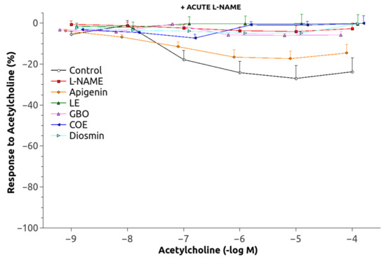 The dose-response curve to Phe was significantly shifted upwards in the animals chronically treated with L-NAME (Figure 3) and pEC50 values were significantly increased as compared to the controls (Table 2). The responses of the groups treated with L-NAME and flavonoids were not significantly different, but GBO, COE, and D also showed a greater pEC50 than that of the control group. Maximal Ach-induced vasodilatation (Figure 4) was significantly reduced in aortic rings from L-NAME hypertensive rats compared to control rats (Table 2). The relaxation to Ach improved in the aorta from rats treated with A, LE and COE but the relaxation still remained lower than in control rats. After administration of acute L-NAME (10−4 mol/L) to these aortic rings (Figure 5), the relaxant responses were further reduced, but there were some residual responses in the A and COE groups.