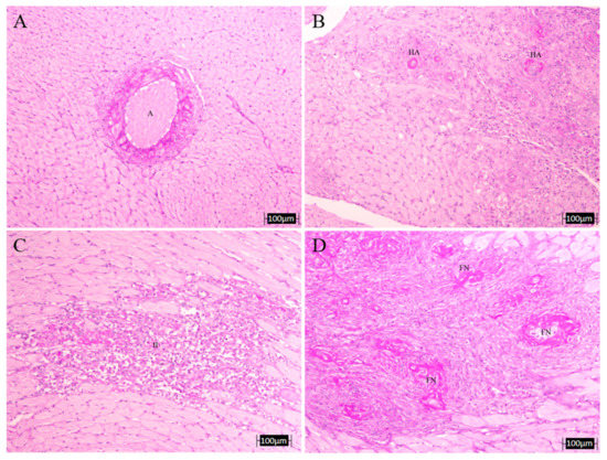 Representative microphotographs of heart lesions. Upper left: intramyocardial artery (A) of a control non-treated rat (no morphological alterations, PAS, 10×); (B) hyaline arteriopathy (HA) in a coronary artery of L-NAME-treated rat (PAS, 10×); (C) intense vascular damage with inflammatory infiltrate (II) and myocardiocytes lesions in a L-NAME-treated rat heart (PAS, 10×); (D) fibrinoid necrosis (FN) in a coronary artery of L-NAME-treated rat (PAS, 10×).