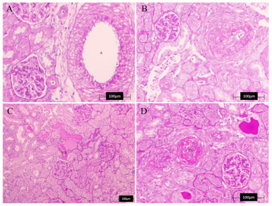 Representative microphotographs of kidney lesions. (A) renal artery (A) of a control non-treated rat (no morphological alterations, PAS, 20×); (B) muscular hypertrophy and lumen reduction in a renal artery (V) of L-NAME-treated rat (PAS, 20×); (C) hyaline arteriopathy (HA) and lumen reduction in a renal artery of L-NAME-treated rat (PAS, 10×); (D) fibrinoid necrosis (FN) in a renal artery of L-NAME-treated rat (PAS, 20×).