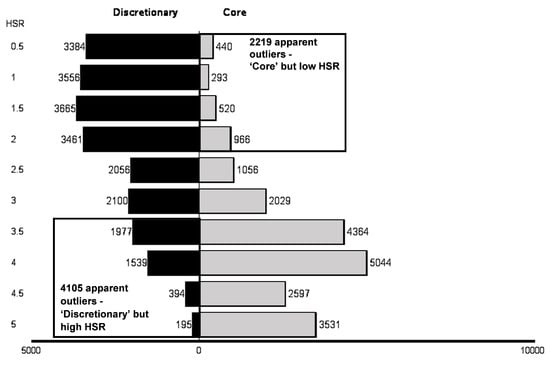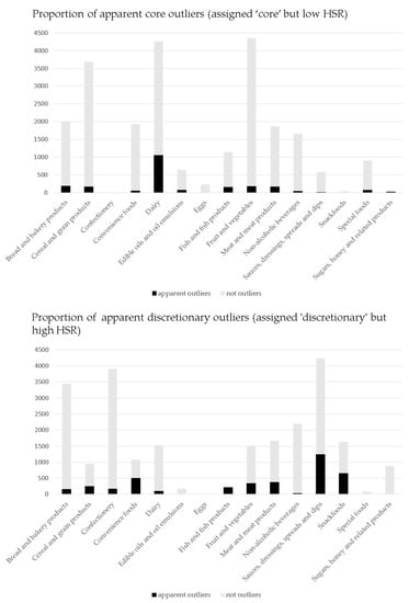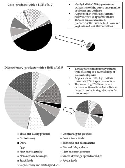 - Apparent outliers that scored a high HSR but were assigned ‘discretionary’ status by the ADGs were not considered ‘genuine outliers’ if nutrient values for salt, saturated fat and/or sugar were not sufficiently high to warrant at least one red traffic light.