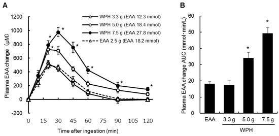 Plasma EAA concentration (A) changes from baseline and (B) AUCs. Values are mean ± standard error of the mean. * Significantly different from EAA, p < 0.05. AUC: area under the curve; WPH: whey protein hydrolysate; EAA: essential amino acids.