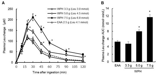 The main purpose of this study was to investigate the effects of ingestion of WPH on postprandial aminoacidemia, especially plasma leucine appearance, compared to that of an amino acid mixture. We compared 3 doses (7.5, 5.0 and 3.3 g of protein) of the WPH to 2.5 g of the EAA mixture as the control, and we found that ingestion of 3.3 g of the WPH, which contained lower amounts of EAA and leucine compared with the EAA mixture, induced plasma EAA and leucine levels similar to that of the EAA mixture. Furthermore, even though 5.0 gm of the WPH and 2.5 g of the EAA mixture contained similar amounts of EAA and leucine, ingestion of 5.0 g of the WPH caused higher plasma EAA and leucine levels compared to the EAA mixture. In plasma histidine, isoleucine, methionine, phenylalanine, threonine, tryptophan and valine levels, ingestion of the WPH also induced higher aminoacidemia compared to the EAA mixture when those contained similar amounts of the amino acid. These results suggest that the WPH can induce a greater degree of aminoacidemia compared with a free amino acid mixture when those preparations are ingested orally. Although it is well known that free amino acids are absorbed rapidly and can induce rapid postprandial aminoacidemia, to our knowledge it is the first study that indicated that oral ingestion of protein hydrolysate may induce higher plasma amino acid levels compared with that of a free amino acid mixture.