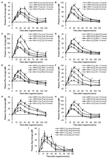 Plasma amino acids concentration changes from baseline. (A), His; (B), Ile; (C), Lys; (D), Met; (E), Phe; (F), Thr; (G), Trp; (H), Val; (I), Arg. Values are mean ± standard error of the mean. * Significantly different from EAA, p < 0.05. His: histidine; Ile: isoleucine; Lys: lysine; Met: methionine; Phe: phenylalanine; Thr: threonine; Trp: tryptophan; Val: valine; Arg: arginine; WPH: whey protein hydrolysate; EAA: essential amino acids.