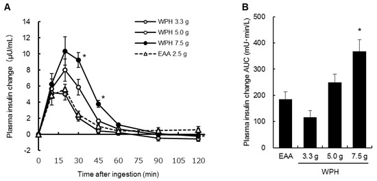 Figure 4A,B show the changes from baseline and the AUCs of the plasma insulin concentrations. Significant treatment × time interactions were observed in the insulin concentration changes from baseline (p < 0.001). The insulin concentration changes at 30 and 45 min after ingestion of 7.5 g of the WPH were significantly higher than those of the EAA mixture at the same time points. The plasma insulin concentration AUCs after ingestion of 7.5 g of the WPH were also significantly higher than that of the EAA mixture. There were no significant differences between the ingestion of the EAA mixture and of 3.3 and 5.0 g of the WPH in the plasma insulin concentration changes and AUCs.