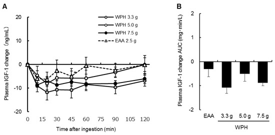Figure 5A,B show the changes from baseline and the AUCs of the plasma IGF-1 concentrations, and Table 3 shows the changes from baseline of the plasma glucose concentrations. In the plasma glucose and IGF-1 changes, there were significant main effects of time (p < 0.001), but there were no significant interactions or main effects of treatment. There were no significant differences between the ingestion of the EAA mixture and of each dose of the WPH in the plasma IGF-1 AUCs.
