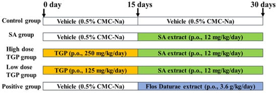 Schematic representation of the experimental procedure. SA, Strychnos alkaloid; TGP, total glucosides of Paeoniae Radix Alba. CMC, carboxyl methyl cellulose.
