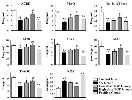 Determination results of rat brain samples collected from different groups. Each value was represented as mean ± SD (standard deviation). (* p < 0.05, ** p < 0.01 SA group vs. control group; # p < 0.05, ## p < 0.01 TGP group vs. SA group). AChE, acetylcholinesterase; MAO, monoamine oxidase; SOD, superoxide dismutase; CAT, catalase; GSH, reduced glutathione; T-AOC, total antioxidant capacity; ROS, reactive oxygen species.