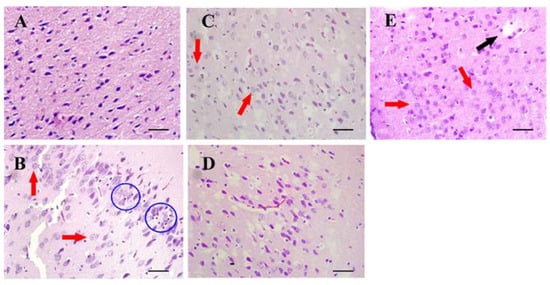 Representative histopathological photographs of rat cerebral cortexes (20×): (A) control group; (B) SA group; (C) low dose TGP group; (D) high dose TGP group; (E) positive group. The black arrow, liquefactive necrosis; red arrows, glial cells; blue circles, neuronophagia. Scale bar = 50 μm.