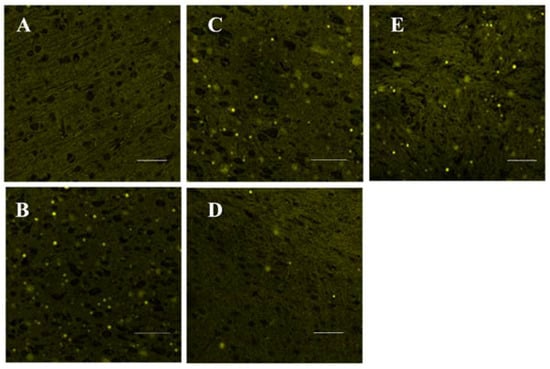 Representative photographs of Nile-red staining (400×). (A) control group; (B) SA group; (C) low dose TGP group; (D) high dose TGP group; (E) positive group. Scale bar = 50 μm.