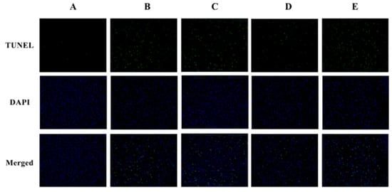 Representative photographs of terminal deoxynucleotidyl transferase-mediated deoxyuridine 5-triphosphate-biotin end labeling (TUNEL) staining (100×). (A) control group; (B) SA group; (C) low dose TGP group; (D) high dose TGP group; (E) positive group.