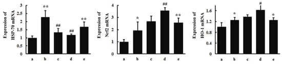 The gene expression levels of heat shock protein 70 (HSP-70), nuclear factor E2-related factor 2 (Nrf2), and heme oxygenase (HO-1) in rat brain. (a) control group; (b) SA group; (c) low dose TGP group; (d) high dose TGP group; (e) positive group. Values were expressed as mean ± SD. (* p < 0.05, ** p < 0.01 other groups vs. control group; # p < 0.05, ## p < 0.01 TGP group vs. SA group).