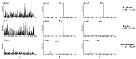 The ESI positive ion mode was employed for the structures of SAs with a basic nitrogen atom. Acetaminophen had been successfully used as the IS for LC-MS assays for Str and Bru in a previous experiment conducted by our team []. Product ion mass spectra for Str, Bru, and IS were acquired by using injections of individual standard solutions (each at 300.0 ng/mL) to screen precursor and product ion pairs to monitor. The most abundant fragment ions in MRM mode were chosen for the detection of each compound. Determined ion transitions were 335.06→263.70 for Str, 395.17→243.73 for Bru, and 151.94→109.97 for IS.
