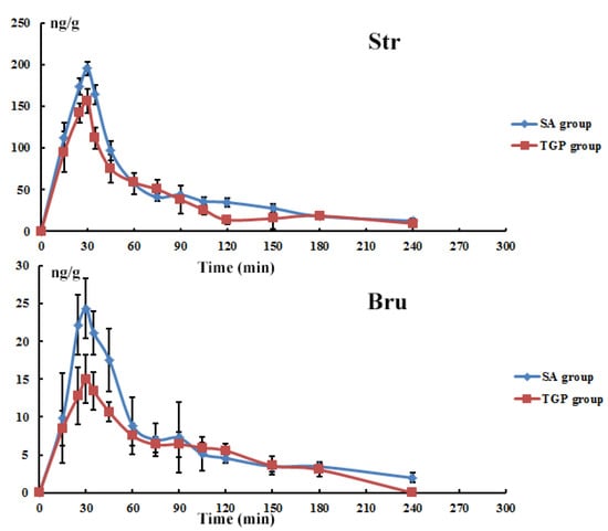 Tissue time course of Str and Bru in the SA group and TGP group in brain. There were at least three rats per time point in each group. Each point represents mean ± SD.