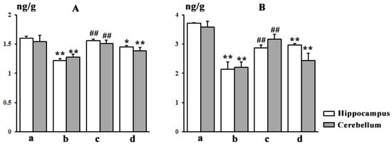 The brain-derived neurotrophic factor (BDNF) (A) and nerve growth factor (NGF) (B) levels of different group in the hippocampus and cerebellum. (a) control group; (b) SA group; (c) high dose TGP group; (d) positive group. (* p < 0.05, ** p < 0.01 other groups vs. control group; # p < 0.05, ## p < 0.01 TGP group vs. SA group).