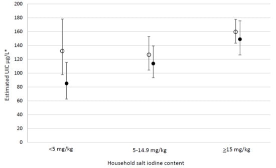 - Rohner, F.; Wirth, J.; Woodruff, B.; Chiwile, F.; Yankson, H.; Sesay, F.; Koroma, A.; Petry, N.; Pyne-Bailey, S.; Dominguez, E.; et al. Iodine status of women of reproductive age in sierra leone and its association with household coverage with adequately iodized salt. Nutrients 2016, 8, 74. [Google Scholar] [CrossRef] [PubMed]