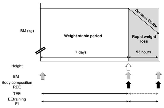 Experimental design. Abbreviations: BM, body mass; REE, resting energy expenditure; TEE, TEE during rapid weight loss indicated by dashed arrow was obtained by conversion of the TEE during the weight stable period into 53 h; EEtraining, energy expenditure during training calculated by rate of the perceived exertion with METs compendium; EI, energy intake.