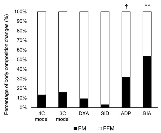 Ratio of body composition changes after rapid weight loss. Data are expressed as mean ± SD, n = 8. ** p < 0.01 vs. 4C model, 3C model, DXA, SID, and ADP using Bonferroni post-hoc test. † p < 0.05 vs. 4C model, 3C model, DXA, and SID using the Bonferroni post-hoc test.