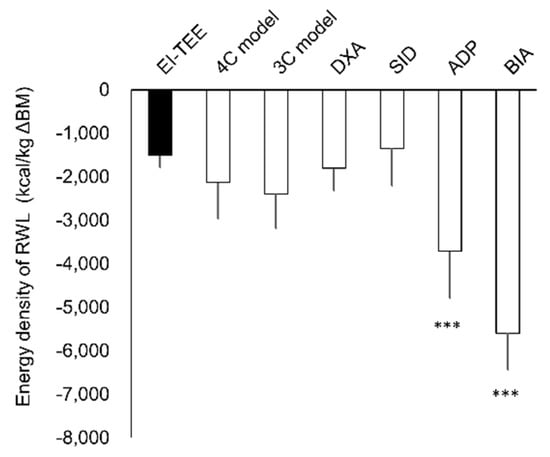 The aims of the present study were (1) to measure the required energy deficit during RWL using the DLW method and EI (EI-TEE); (2) to assess whether energy balance was accurately estimated from body composition changes using the 4C model; and (3) to examine the accuracy of the energy balance estimated by body composition change using the 3C model, dual energy X-ray absorptiometry (DXA), stable isotope dilution (SID), air displacement plethysmography (ADP), and BIA. We hypothesized that the 4C model with current body energy density model could accurately assess energy balance during RWL. We postulated that the secondary indirect methods (e.g., BIA) would produce results with large errors in estimating body composition changes because these methods are affected by assumptions such as TBW distribution.