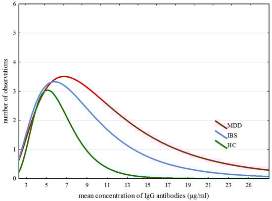 Figure 2 shows specific traits of distribution of averaged results across all three groups. Detailed analysis of ex-Gaussian distribution of total IgG values suggests a dissimilarity in immune responses between participants from the examined groups. The outliers of IgG levels are shaped from approximately 19–28, from approximately 14–20 and from approximately 9–13 in the MDD, IBS and HC groups, respectively.