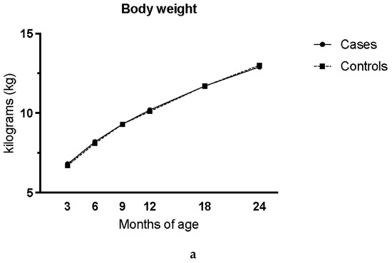 Energy intake and body weight increased as expected with age for both cases and controls (Figure 2a,b). The mean daily intake of milk powder increased in both cases and controls by 12 months of age and more significantly between 6 months and 9 months of age, respectively (Figure 2c). At 6 months, the intake of milk powder was 15.9 g and 15.3 g per day for cases and controls respectively. At 9 months it had increased to 28.1 grams and 25.4 grams per day for cases and controls and at 24 months it had decreased to 13.3 grams and 14.7 grams per day for cases and controls.