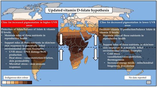 The vitamin D–folate hypothesis is one of the main theories potentially explaining the evolution of human skin pigmentation. It is apparent that human skin tones arose as an adaptation to our UVR climate, with individuals of the darkest pigmentation having an origin in high-UVR areas near to the equator and lighter-skinned populations arising in low-UVR regions closer to the poles. This pattern arose as a result of two clines in skin pigmentation, whereby our early human ancestors firstly evolved to have darker skin pigmentation while residing in Africa but then evolved to lose their pigmentation when out-of-Africa migrations occurred [25]. The vitamin D–folate hypothesis proposes that these two clines of skin pigmentation evolved as a balancing mechanism to maintain levels of two vitamins: vitamin D and folate [16].