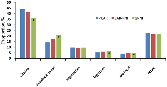 Comparing the dietary zinc intakes corresponding to <EAR, EAR-RNI, and ≥RNI, we found that dietary zinc from grains decreased, while those from livestock meat, legumes, and seafood increased from EAR to RNI. Zinc from grains decreased by 7.7% in the ≥ RNI level compared to the < EAR level, while zinc from livestock meat increased by 6.5% (Figure 1).
