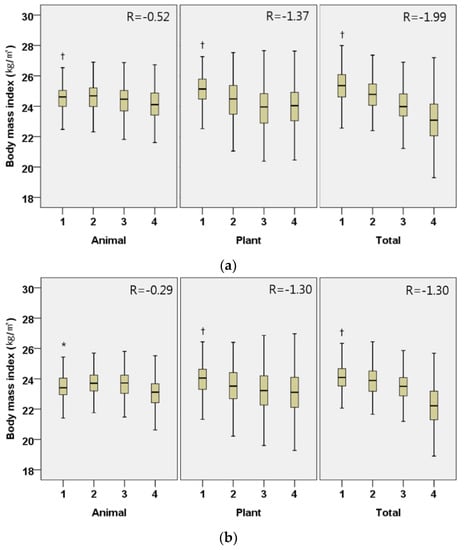 Adjusted body mass index (kg/m2) by the quartiles of daily animal, plant, and total protein intake per weight (g/kg/day) in Korean elderly population. (a) Male; (b) Female. All models are adjusted for age (year), household income quartile, education (≤9 years, 10–12 years, 13≤ years), presence of chronic disease (yes or no), current smoking status (yes or no), alcohol intake frequency per week (0, 1, 2≤), physical activity (MET/week), % energy from fat (%), % energy from carbohydrate (%) and total energy intake (kcal). Participants were divided into quartiles for daily animal, plant, and total protein intake per weight (g/kg/day); male animal (Q1 < 0.13, Q2 0.13–0.29, Q3 0.30–0.56, Q4 0.56<), male plant (Q1 < 0.45, Q2 0.45–0.61, Q3 0.62–0.79, Q4 0.79<), male total (Q1 < 0.70, Q2 0.70–0.97, Q3 0.98–1.30, Q4 1.30<), female animal (Q1 < 0.07, Q2 0.07–0.21, Q3 0.21–0.40, Q4 0.40<), female plant (Q1 < 0.42, Q2 0.42–0.57, Q3 0.58–0.74, Q4 0.74<), female total (Q1 < 0.59, Q2 0.59–0.82, Q3 0.83–1.14, Q4 1.14<); β-coefficient (95% confidence interval) male animal −0.29 (−0.52, −0.05), male plant −1.30 (−1.55, −1.06), male total −1.30 (−1.58, −1.02), female animal −0.52 (−0.75, −0.30), female plant −1.37 (−1.60, −1.14), female total −1.99 (−2.29, −1.70); * p < 0.05, † p < 0.001 by trend test.