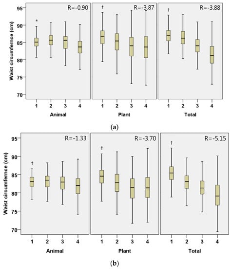 Adjusted waist circumference by the quartiles of daily animal, plant, and total protein intake per weight (g/kg/day) in Korean elderly population. (a) Male; (b) Female. All models are adjusted for age (year), household income quartile, education (≤9 years, 10-12 years, 13≤ years), presence of chronic disease (yes or no), current smoking status (yes or no), alcohol intake frequency per week (0, 1, 2≤), physical activity (MET/week), % energy from fat (%), % energy from carbohydrate (%) and total energy intake (kcal). Participants were divided into quartiles for daily animal, plant, and total protein intake per weight (g/kg/day); male animal (Q1 < 0.13, Q2 0.13–0.29, Q3 0.30–0.56, Q4 0.56<), male plant (Q1 < 0.45, Q2 0.45–0.61, Q3 0.62–0.79, Q4 0.79<), male total (Q1 < 0.70, Q2 0.70–0.97, Q3 0.98–1.30, Q4 1.30<), female animal (Q1 < 0.07, Q2 0.07–0.21, Q3 0.21–0.40, Q4 0.40<), female plant (Q1 < 0.42, Q2 0.42–0.57, Q3 0.58–0.74, Q4 0.74<), female total (Q1 < 0.59, Q2 0.59–0.82, Q3 0.83–1.14, Q4 1.14<); β-coefficient (95% confidence interval) male animal −0.90 (−1.58, −0.22), male plant −3.87 (−4.58, −3.16), male total −3.88 (−4.68, −3.08), female animal −1.33 (−1.95, −0.71), female plant −3.70 (−4.42, −2.99), female total −5.15 (−5.93, −4.37); * p < 0.05, † p < 0.001 by trend test.