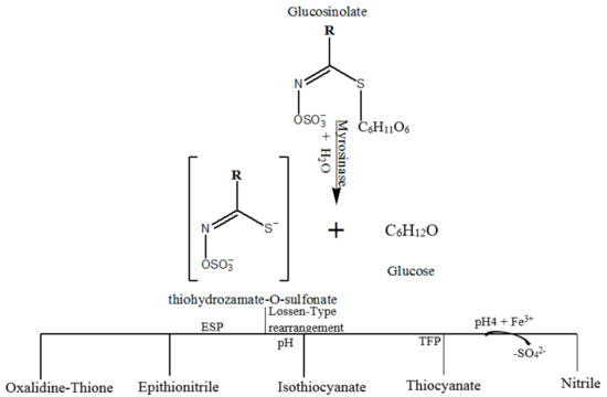 General model of glucosinolates’ hydrolysis by myrosinase to form various specific compounds. ESP and TFP represent epithiospecifier protein and thiocyanate forming protein respectively. The figure was adapted from Fuentes et al. [].