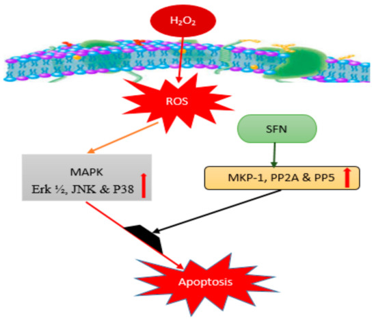 SFN was also reported to hamper the progression of Parkinson’s disease (PD) through the interception of pro-inflammatory and apoptotic pathways in a PD animal model induced by intrastriatal injection of 6-hydroxydopamine (6-OHDA) for 28 days []. In this light, SFN exhibited its neuroprotective activity against the neurotoxic effect of 6-OHDA on dopaminergic neurons due to its modulatory activation of ERK1/2. Where, the up-regulated phosphatases including mitogen-activated protein kinase phosphatase-1 (MKP-1), protein phosphatase type 2A (PP2A) and protein phosphatase 5 (PP5) suppress the effect of cytokines known as mitogen-activated protein kinase (MAPK) and derivatives, which in turn protect neurons from oxidative damage as demonstrated in Figure 3.