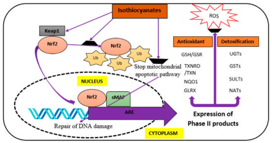 Proposed molecular mechanism of actions through which ITCs elicit their neuroprotective effect. ARE, Antioxidant response element; Glrx, Glutaredoxin; GSH, Glutathione; GSR, Glutathione-disulfide reductase; GSTs, Glutathione S-transferase; Keap1, Kelch-like ECH-associated protein 1; NATs, N-acetyltransferases; Nrf2, nuclear factor erythroid 2-factor 2; NQO1, NAD(P)H quinone dehydrogenase 1; ROS, Reactive oxygen species; sMAF, proto-oncogene response element; SULTs, Sulfotransferases; TXN, Thioredoxin; TXNRD, Thioredoxin reductase; Ub, Ubiquitin; UGTs, UDP glucuronosyltransferases. Adapted from Giacoppo et al. [].