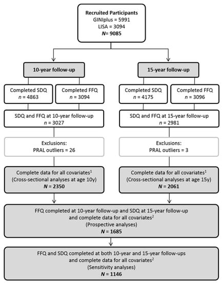 For the present analyses, data from the ongoing German birth cohort studies GINIplus and LISA were combined. The GINIplus study (German Infant Nutritional Intervention plus environmental and genetic influences on allergy development) included 5991 healthy newborns from urban Munich and rural Wesel; families were recruited between September 1995 and June 1998. The LISA cohort (Influences of lifestyle-related factors on the immune system and the development of allergies in childhood) included 3094 healthy newborns; families were recruited between November 1997 and January 1999 from Munich, Wesel, Leipzig, and Bad Honnef. Details on the study designs and subject recruitment have been described previously [,]. Both studies were conducted in accordance with the ethical standards laid down in the Declaration of Helsinki and approved by the local ethics committees (Bavarian General Medical Council, University of Leipzig, Medical Council of North Rhine-Westphalia). All of the participants’ families gave written informed consent before study onset. For the present examination, we focused on the assessments at age 10 and 15 years, since the study schedule at this age included the assessment of detailed information on dietary intake, mental health outcomes, and covariates (by questionnaires or during medical examinations).