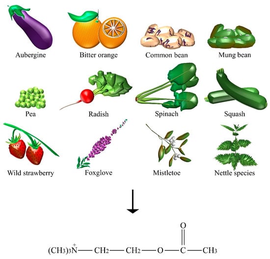 In humans, ACh serves as a NT at the neuromuscular junctions, ganglionic synapses, and at diverse sites within the central nervous system. Its presence (Figure 1) is documented in more than 50 plant species belonging to all the major systematic groups, comprising the most economically important plant families: Gramineae, Leguminosae, and Solanaceae []. In particular, extracts from Cucurbita pepo L. (that is, squash), Solanum melongena L. (that is, aubergine), and Spinacia oleracea L. (that is, spinach) were reported to contain a considerable amount of ACh []. Besides its presence in plants that could suggest its role in the regulation of membrane permeability or specific metabolic pathways [], ACh was found in the seeds of Pisum sativum L. (that is, pea), Phaseolus radiatus L. (that is, mung beans), and Phaseolus vulgaris L. (that is, common bean), thus, indicating a possible role during germination []. The fruits of Citrus aurantium L. (that is, bitter orange), Fragaria vesca L. (that is, wild strawberry) [], and the edible root vegetable of Raphanus raphanistrum subspecies sativus L. (that is, radish) [] were indicated to contain Ach. The highest concentrations of ACh was found in the nettle species of Urtica dioica L. (for example, about 0.5 μmol/g dry weight of roots) [] and of Urtica ureus L. [], whose folium and herba are traditionally used as adjuvants in minor urinary problems and articular pain. Other plants, such as Viscum album L. (that is, mistletoe) and Digitalis purpurea L. (that is, foxglove), contain significant amounts of ACh []. In particular, mistletoe had a traditional use in the treatment of patients with high blood pressure, arteriosclerosis, hypertensive headache, epilepsy, chorea, hysteria, and other neurological diseases []. The cardiac-depressant and sedative properties of mistletoe were attributed to various biologically active constituents, such as ACh itself, but also to histamine and GABA [].