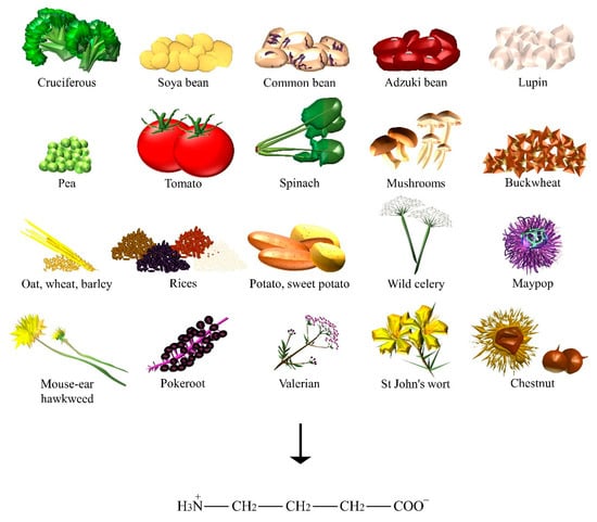 GABA is a major inhibitory NT of the vertebrate central nervous system and is found ubiquitously among plants (Figure 3), where can be primarily synthesized from glutamic acid via glutamate decarboxylase enzyme. Levels of GABA were demonstrated to increase in response to biotic and abiotic stresses, such as drought, the presence of salt, wounds, hypoxia, infection, soaking, and germination []. In particular, sprouts of Lupinus angustifolius L. (that is, lupin) [], Vigna angularis W. (that is, adzuki bean) [] and other germinating edible beans, such as Glycine max L. (that is, soya bean) [], common bean, and pea [], were reported to increase GABA content when compared to their raw beans. Furthermore, grains of the Gramineae family, such as Avena nuda L. (that is, oat) [], Triticum aestivum L. (that is, wheat) [], Hordeum vulgare L. (that is, barley) [], and many species of the Oryza genus (for example, white, black, brown, and red rice) [] can also significantly accumulate GABA. Sprouts of Fagopyrum esculentum M. (that is, buckwheat) [] and the fruits of tomato also contain a substantial amount of this amino acid during the mature green stage []. GABA is known for its analgesic effects, anti-anxiety, and hypotensive activity. Food technologies and molecular engineering are employed to synthesize GABA through enzymatic or whole-cell biocatalysis, microbial fermentation (for example, GABA soya yogurt [], black raspberry juice []), and chemical synthesis []. Some authors found one of the highest contents on GABA to be 414 nmol/g of dry weight in raw spinach, followed by Solanum tuberosum L. (that is, potato), Ipomoea batatas L. (that is, sweet potato), and Brassica oleracea L. (that is, cruciferous such as kale and broccoli). Mushrooms, such as Lentinula edodes B. (that is, shiitake), and nuts of Castanea genus (that is, chestnut) also showed a significant amount of GABA []. Among the many types of Chinese teas, the highest content was found in white tea []. As already mentioned, GABA content was found in mistletoe [], but also in Phytolacca americana L. (that is, pokeroot) [], Valeriana officinalis L. (that is, valerian), Angelica archangelica L.(that is, wild celery), Hypericum perforatum L. (that is, St John’s wort), Hieracium pilosella L. (that is, mouse-ear hawkweed), and Passiflora incarnata L. (that is, maypop) [], the latter being used for the relief of mild symptoms of mental stress and as a sleep aid.