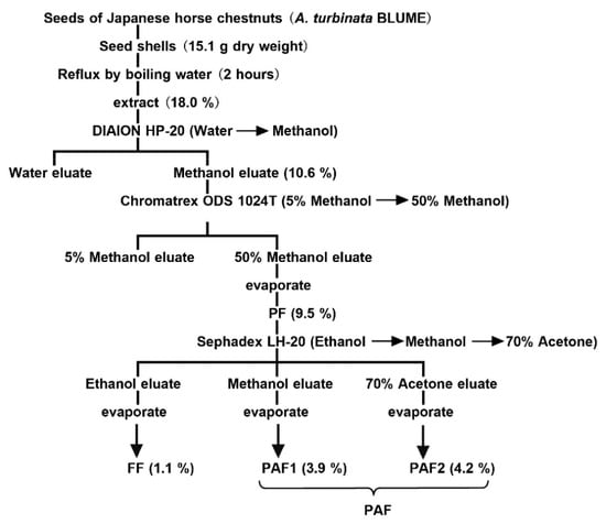 Extraction and purification procedure for a polyphenolic compounds fraction (PF), flavonol O-glycosides fraction (FF), and proanthocyanidin (PAF) from the seed shells of Japanese horse chestnut.