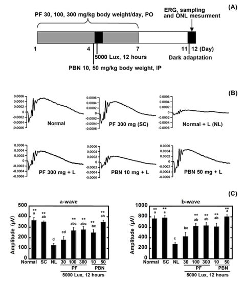 To evaluate the protective effect of PF against light-induced retinal damage, the rats received oral PF for seven days (Figure 2A). After light exposure, a significant decrease of the ERG a-wave and b-wave amplitudes was observed in the group that did not receive PF (negative control; NL) compared with the normal control (Figure 2B,C). However, the retinal damage was suppressed significantly (p < 0.05) in the rats treated with the PF doses of 100 mg/kg and 300 mg/kg. The doses of 10 mg/kg and 50 mg/kg of intraperitoneally injected PBN (positive control) suppressed the retinal damage compared with the negative control. There was no significant difference between the normal control rats and those in the 300 mg/kg group without light exposure (Figure 2B,C).