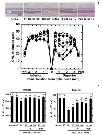 The ONL thickness decreased in the light-exposed retina, especially in the superior retina. However, the result of the ONL AUC shows that there was slight damage in the PF-treated rats. The AUC of the rats treated with the PF doses of 100 mg/kg and 300 mg/kg was larger than the 10 mg/kg PBN groups, but not the 50 mg/kg PBN groups (Figure 3).
