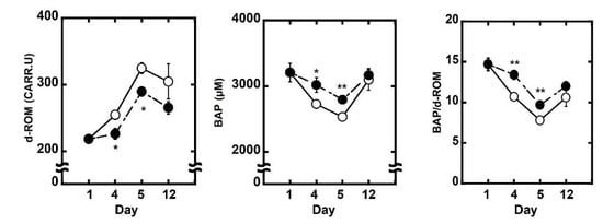 To analyze levels of oxidation stress, antioxidant capacity and potential antioxidant capacity of whole body, diacron-reactive oxygen metabolites (d-ROM) and biological antioxidant potential (BAP) tests of plasma were performed, and the BAP/d-ROM ratio was evaluated. Light exposure, dosage, and dosage methods of PF were the same as mentioned previously. Thereafter, 2% heparin-added whole blood was withdrawn from the tail vein at the day 1, day 4 (before light exposure), day 5 (after the light exposure), and day 12. The blood samples were centrifuged at 5000× g for 5 min to obtain the supernatants as the plasma samples. The analysis was performed using a free-radical analyzer system (FREE Carpe Diem, Wismerll Company Ltd., Tokyo, Japan) [15].