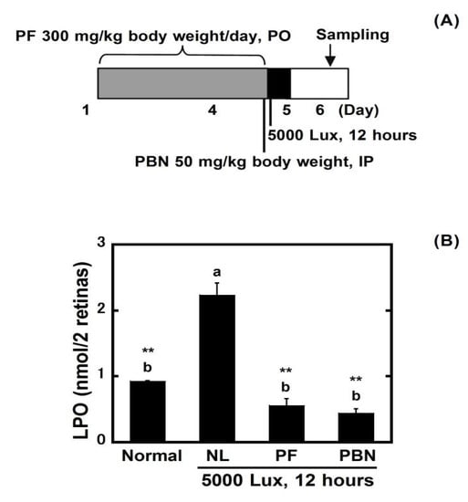 Inhibition of light-induced retinal lipid peroxidation. (A) Experimental design. The rats received oral PF (300 mg/kg of body weight/day) once daily for four days. PBN (50 mg/kg body weight) was administered 30 min before light exposure by intraperitoneal injection. On the fourth day, the rats were exposed to intense light (5000 lux) for 12 h, after which they were returned to the dim cyclic light conditions. The eyes were enucleated 24 h after light exposure. PO indicates per os; (B) The result of the lipid hydroperoxide (LPO) assay. Data represent the mean ± SEM (n = 4). These data show the results of analysis by Tukey’s method and Dunnett’s method. Alphabets (a and b) indicate values that differ significantly between each group (p < 0.05) tested by Tukey’s method. Asterisks indicate values that differ significantly to negative control tested by Dunnett’s method (* p < 0.05, ** p < 0.01).