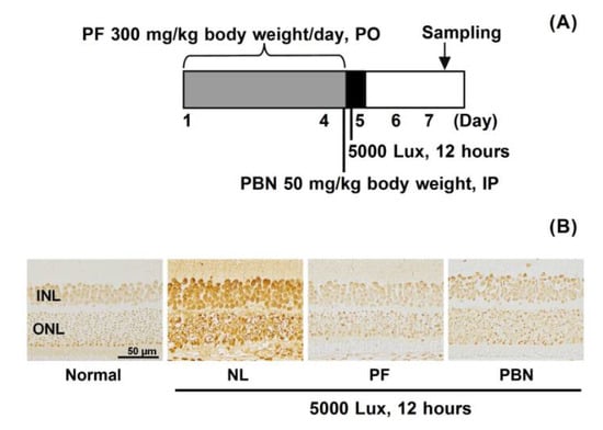Inhibition of light-induced retinal cell apoptosis. (A) Experimental design (n = 4). The rats received oral PF (300 mg/kg of body weight/day) once daily for four days. PBN (50 mg/kg of body weight) was administered 30 min before light exposure by intraperitoneal (IP) injection. On the fourth day, the rats were exposed to intense light (5000 lux) for 12 h, after which they were returned to the dim cyclic light conditions. The eyes were enucleated 48 h after light exposure. PO indicates per os; (B) Representative TdT-mediated dUTP nick end labeling (TUNEL) staining images are shown.