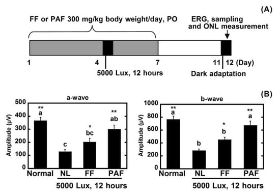 Evaluation of FF and PAF against light damage. (A) Experimental design. The rats received oral FF or PAF (300 mg/kg of body weight/day) once daily for seven days (four days before and three days after light exposure). Intraperitoneal injections of PBN (10 mg/kg and 50 mg/kg body weight) were administered 30 min before light exposure. On the fourth day, the rats were exposed to intense light (5000 lux) for 12 h. After light exposure, the animals were returned to the dim cyclic light conditions; (B) ERG amplitude. The left graph indicates the a-wave and the right graph indicates the b-wave. Normal indicates the normal control, no light exposure, untreated; NL indicates the negative control, light exposure, administration of solvent; FF indicates light exposure, administration of 300 mg/kg of body weight; PAF indicates light exposure, administration of 300 mg/kg of body weight; and PO indicates per os. Data represent the mean ± SEM (n = 6). These data show the results of analysis by Tukey’s method and Dunnett’s method. Alphabets (a, b, and c) indicate values that differ significantly between each group (p < 0.05) tested by Tukey’s method. Asterisks indicate values that differ significantly to the negative control tested by Dunnett’s method (* p < 0.05, ** p < 0.01).
