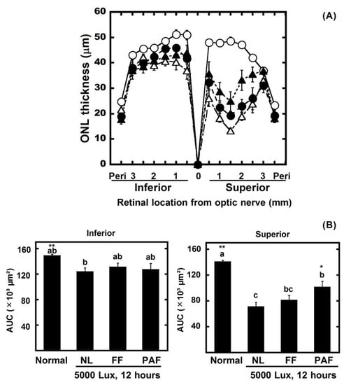 Protective effects of FF and PAF against light-induced retinal histologic damage. After ERG measurement, the ONL thickness was measured in the retinal sections. (A) The ONL thickness in each experimental group is shown. The data are expressed as the mean ± standard error of the mean (n = 6). Normal (○) indicates normal control, no light exposure, untreated; NL (△) indicates negative control, light exposure, administration of solvent; FF 300 (●) indicates light exposure, administration of FF 300 mg/kg of body weight; PAF 300 (▲) indicates light exposure, administration of PAF 300 mg/kg of body weight; and peri indicates the periphery 100 µm from the superior and inferior edges of the retina; (B) Area under the curve (AUC) of Figure 8A. The left graph indicates inferior, and the right graph indicates superior. Data represent the mean ± SEM (n = 6). These data show the results of analysis by Tukey’s method and Dunnett’s method. Alphabets (a, b, and c) indicate values that differ significantly between each group (p < 0.05) tested by Tukey’s method. Asterisks indicate values that differ significantly to the negative control tested by Dunnett’s method (* p < 0.05, ** p < 0.01).