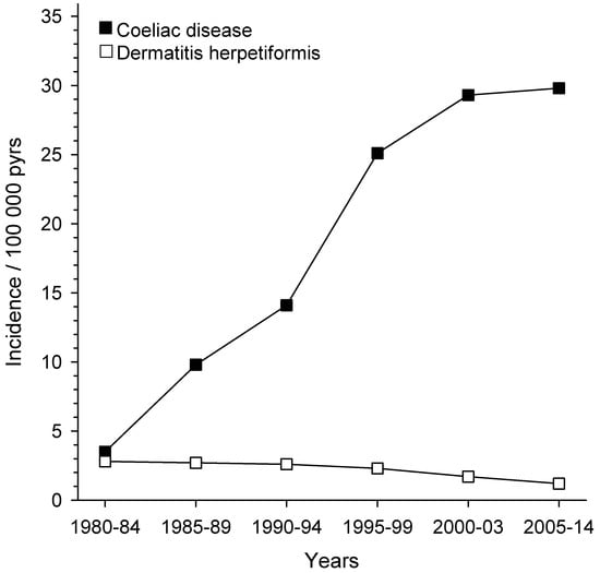 Importantly, a Finnish cohort study [] and a U.K. register study [] covering time periods of 30 and 20 years, respectively, showed convincingly that the annual incidence rate of DH has decreased significantly. This decrease was from 5.2 to 2.7 per 100,000 in the Finnish study and from 1.8 to 0.8 per 100,000 in the U.K. study. The opposite was true for coeliac disease; there was a maximum of a fourfold increase in the incidence rate []. The reason for this seems to be an increasing awareness of mild symptoms, the development of efficient serological screening tests, and the identification of special risk groups, such as family members [,]. Sero-epidemiological studies suggest that in addition to the better recognition of coeliac disease, there has also been a true increase in the incidence in recent decades [,].